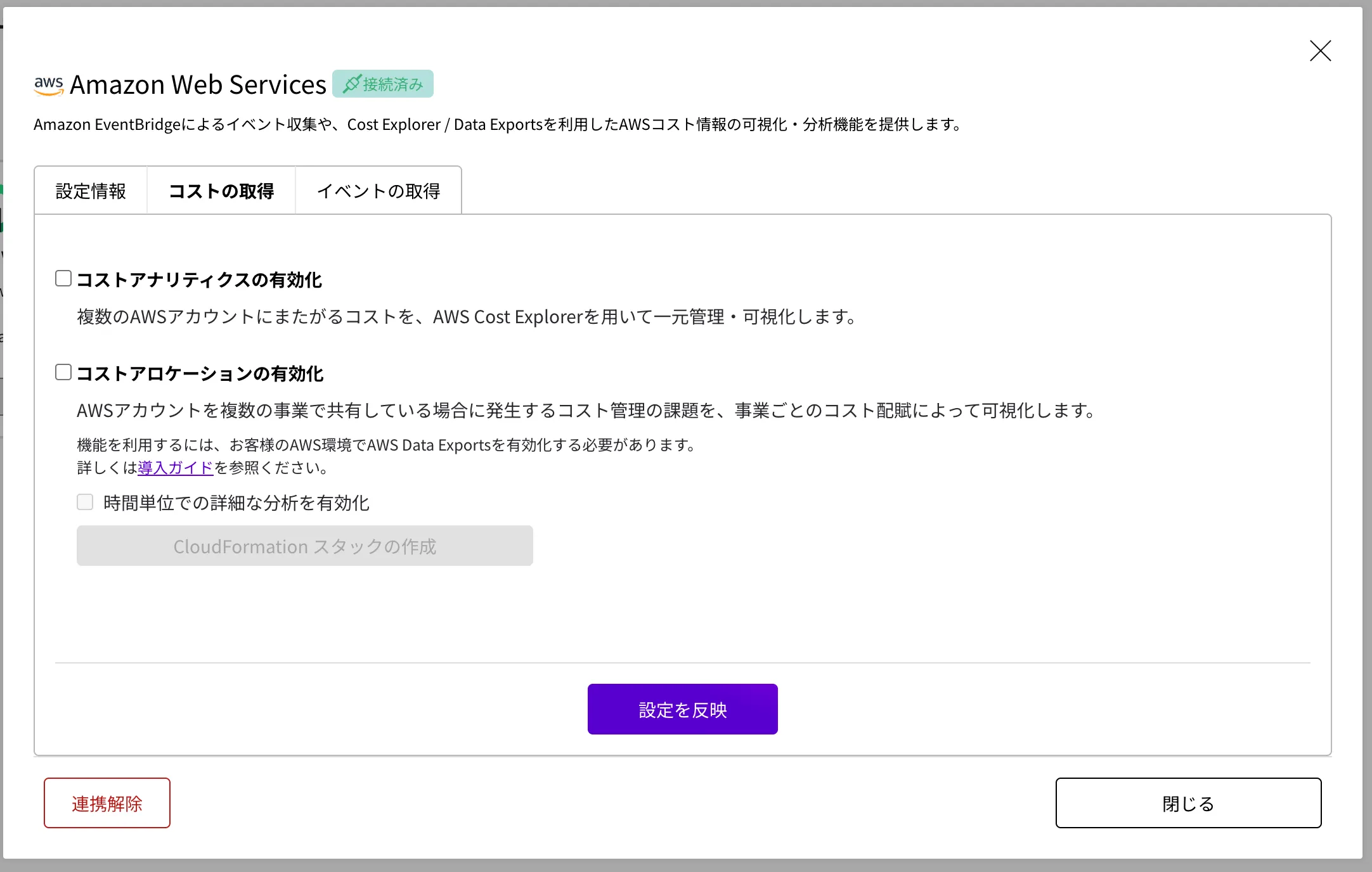 コストの取得を有効化するには、事前に AWS との連携 を完了させておく必要があります。