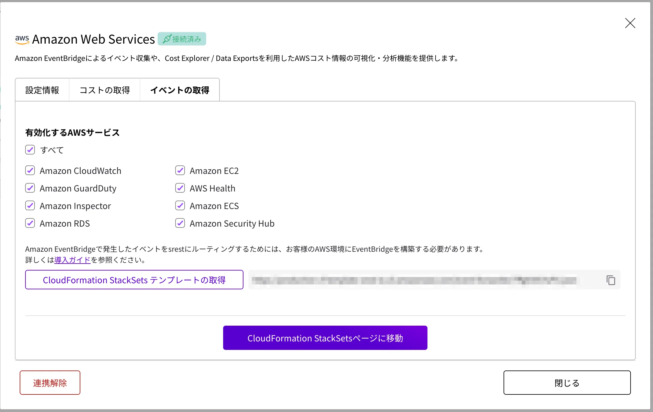 EventBridge から収集するサービスを選択し、[CloudFormation StackSets テンプレートの取得] ボタンをクリックします。